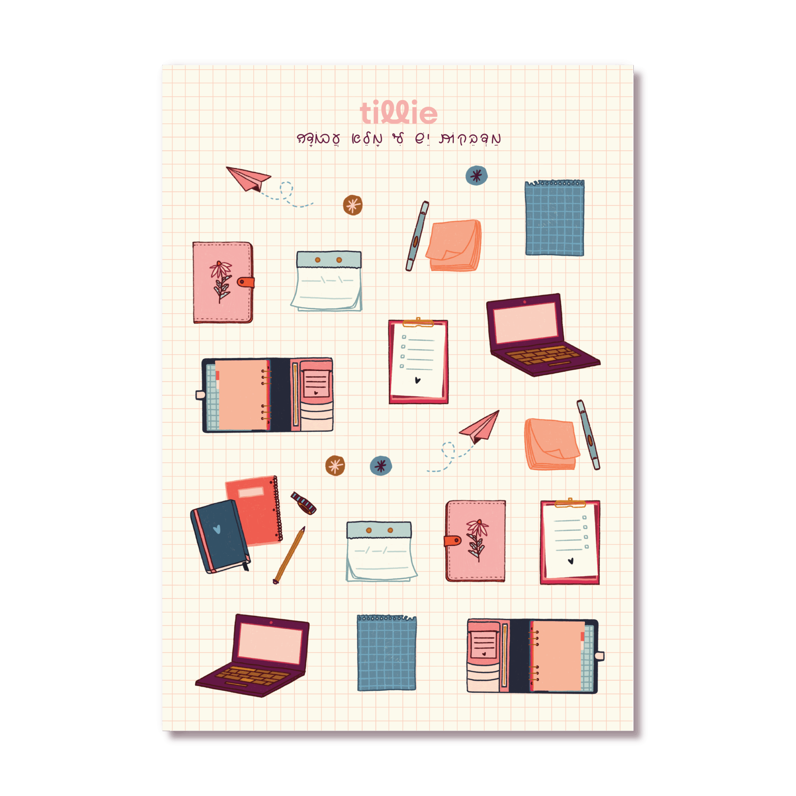 דף מדבקות עם איורים מקוריים של פריטים משרדיים בגווני וורוד: לפטופ, יומן, פנקס רשימות, אימייל ועוד