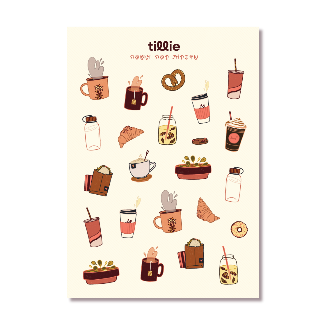 דף מדבקות עם איורים מקוריים של בתי קפה: קפה קר, מאפה, סנדוויץ, בייגלה וכו'.