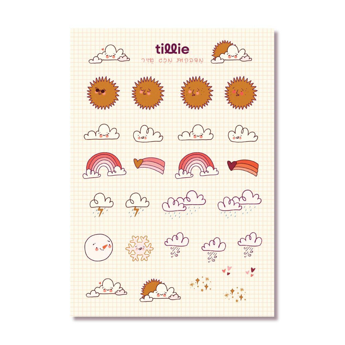 דף מדבקות עם איורים מקוריים של מצבי מזג אוויר שונים: שמש, גשם, קשת, שלג, סופה וכו'.